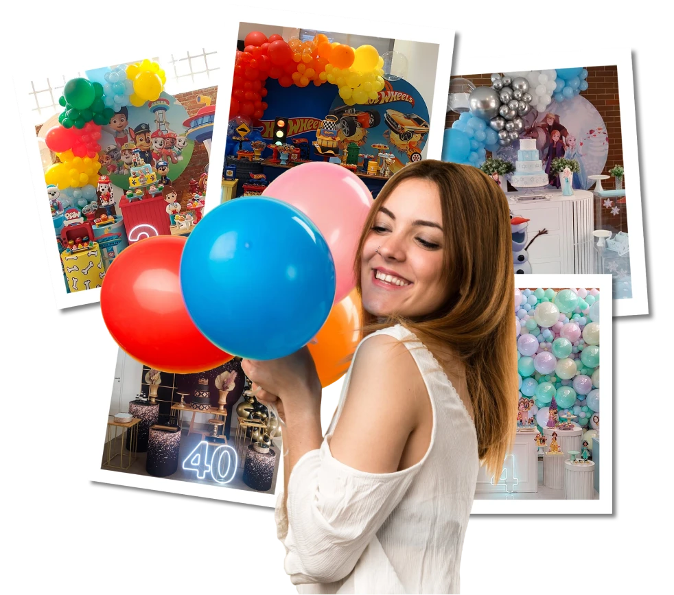 Aqui você encontra também, balões com hélio, arranjos de balões, arcos para decoração.